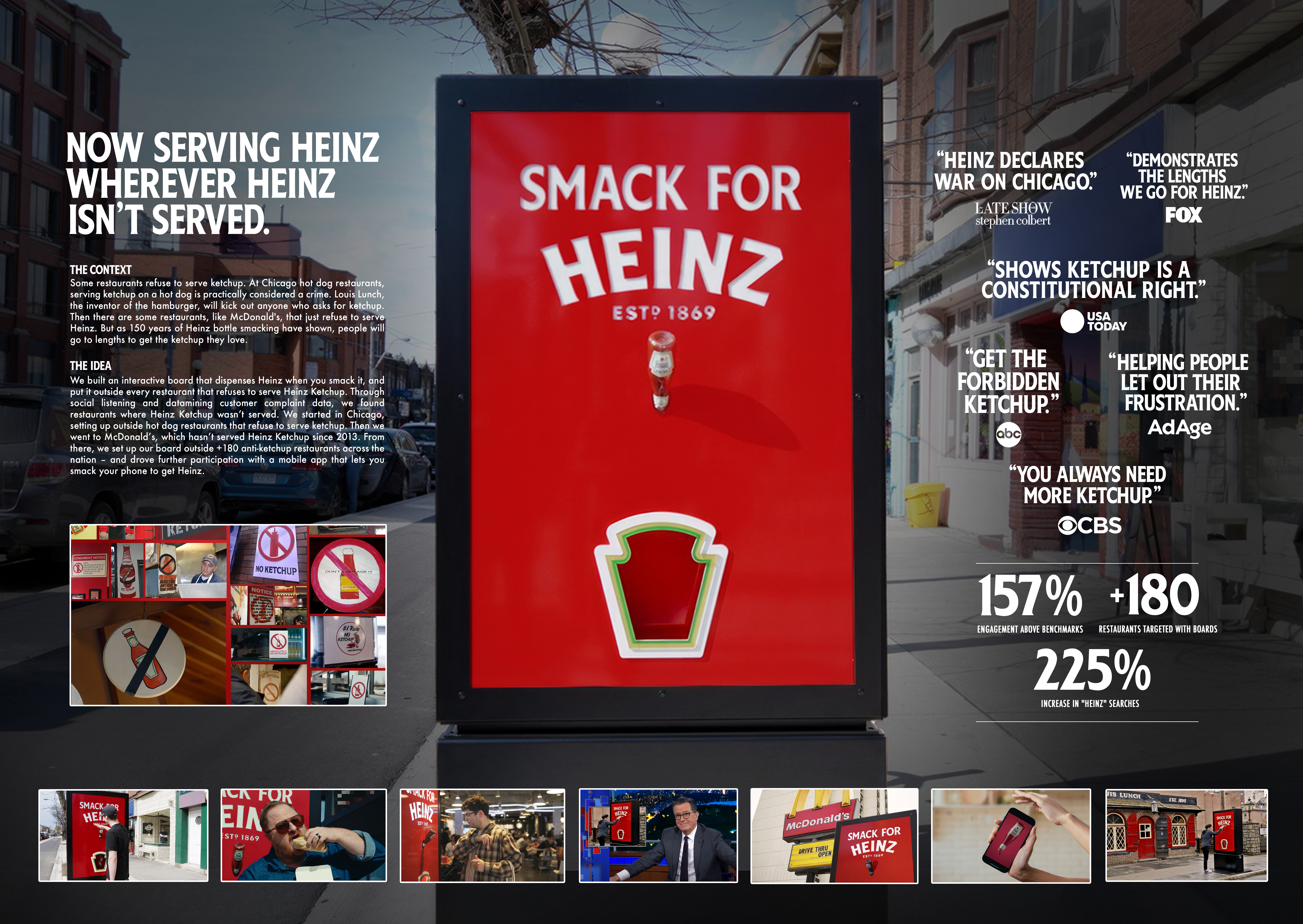 The campaign leveraged the universal gesture associated with Heinz Ketchup – the bottle smack – and created a smackable billboard that dispensed Heinz Ketchup packets. And since the billboards couldn’t be placed within the restaurants, they were placed outside instead. Every time a customer complained about a restaurant not serving Heinz, a board was delivered to the spot.